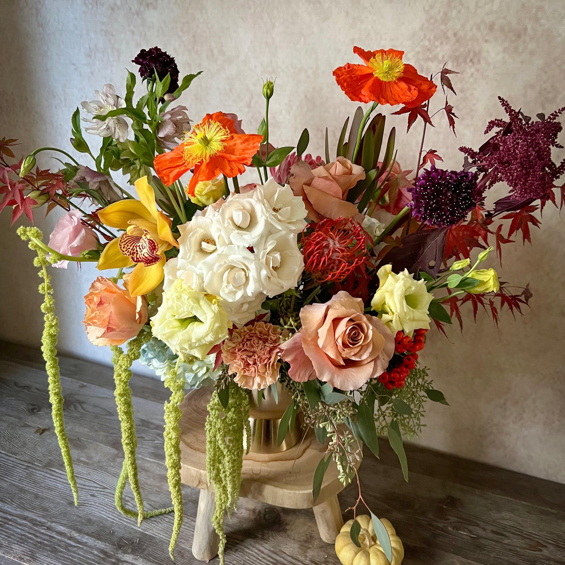 Celebrate the season of gratitude with our Harvest Bloom flower arrangement. This elegant centerpiece features a stunning mix of autumnal flowers—rich orange, deep red and touches of crisp burgundy colors —accented by lush greenery and a hint of seasonal berries in a premium gold urn or rustic metallic urn. Perfect for adding an exquisite, warm, festive touch to your Thanksgiving table, the Harvest Bloom is a beautiful symbol of abundance, family, and the spirit of the season. Whether you're hosting a cozy dinner or a grand gathering, this arrangement will bring nature's beauty and a sense of gratitude to your celebration.